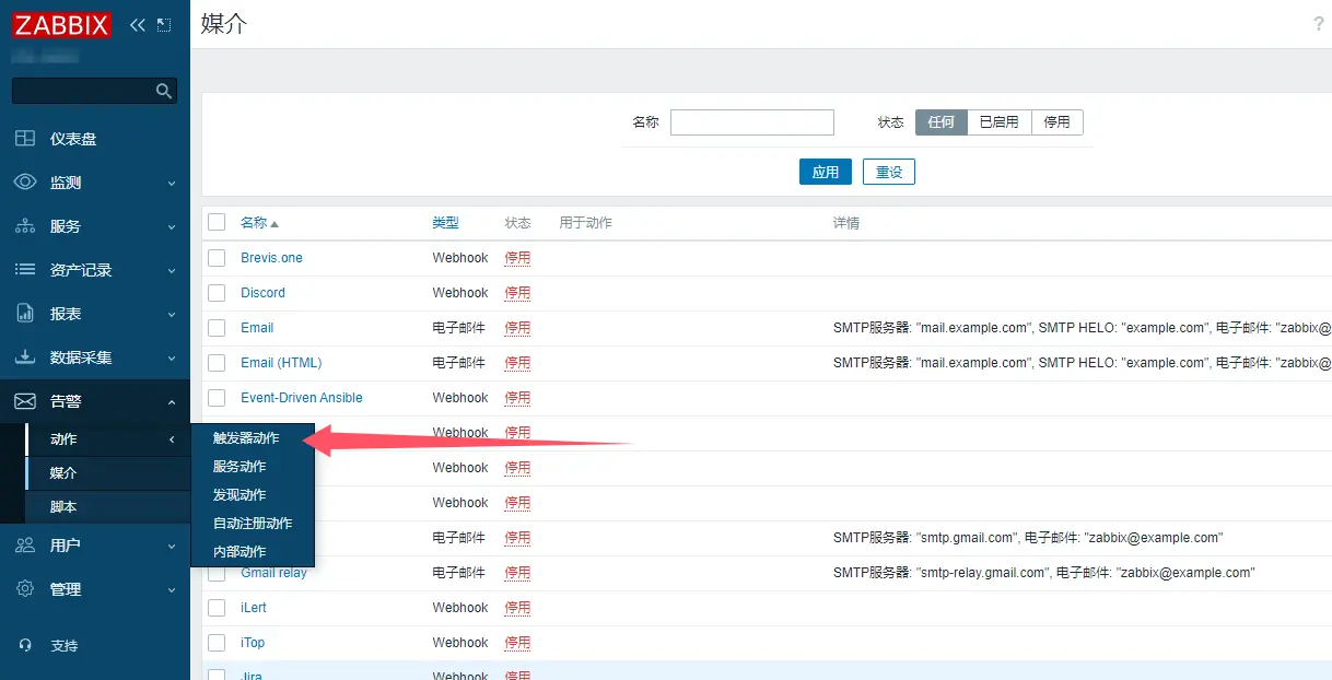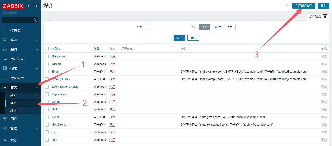 重启zabbix server服务,登录zabbix web控制台添加告警媒介配置。