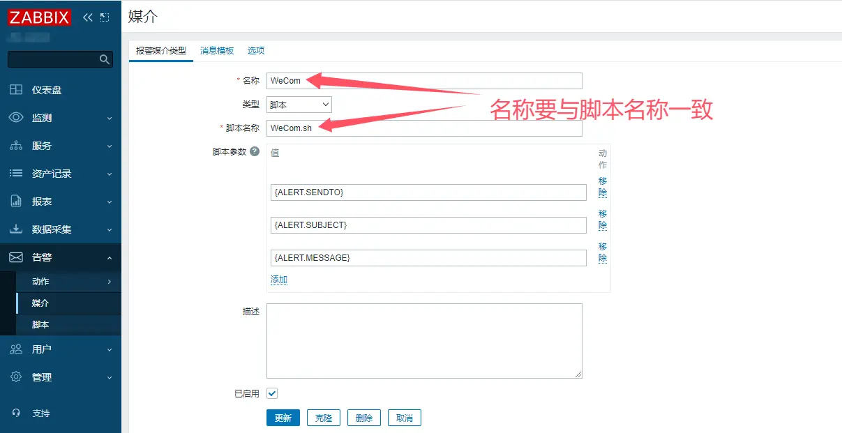 上面图中脚本三个参数的意思 {ALERT.SENDTO}:‘用户媒介配置中的“发送到”值。 {ALERT.SUBJECT}:来自动作配置的“默认主题”值。 {ALERT.MESSAGE}:‘来自动作配置的“默认消息”值