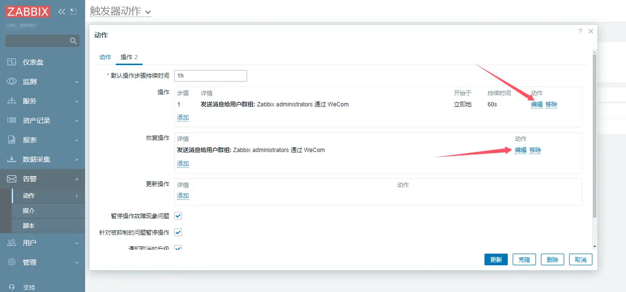# 消息内容****主机名: {HOST.NAME}****> - 监控项目: {TRIGGER.KEY1}> - 监控取值: {ITEM.LASTVALUE}> - 告警等级: {TRIGGER.SEVERITY}> - **当前状态: {TRIGGER.STATUS}**> - 告警信息: {TRIGGER.NAME}> - 告警时间: {EVENT.DATE} {EVENT.TIME}> - 事件ID: {EVENT.ID}编辑故障恢复告警信息内容