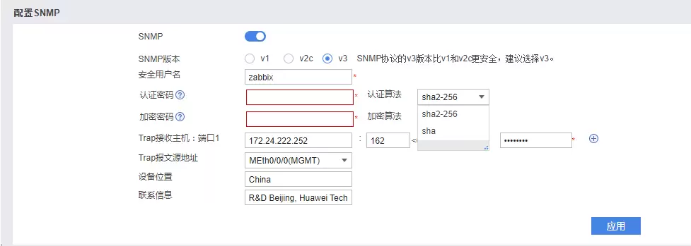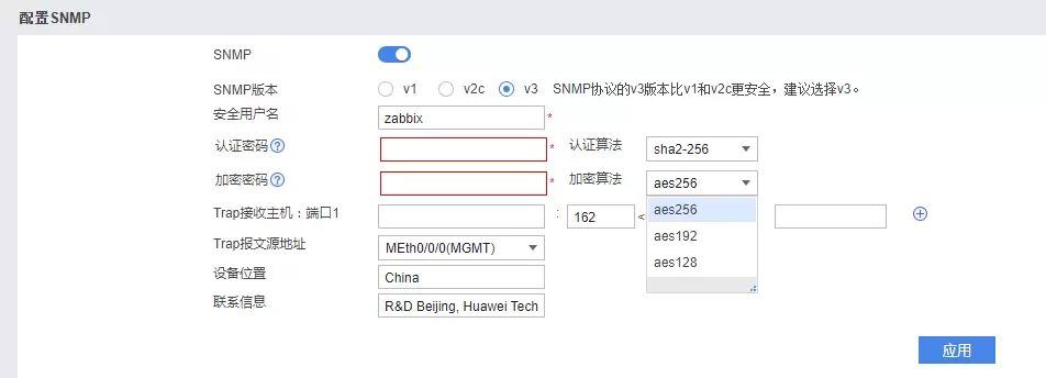 要是觉得SNMPv2c也能监控,没必要使用SNMPv3,那就次打住。而使用SNMPv3监控,网络上文章基本是SHA认证算法+DES加密算法,一篇文章抄来抄去,你想使用这些算法,这些安全厂商也不会给你用这种算法,就像下面这个设备: