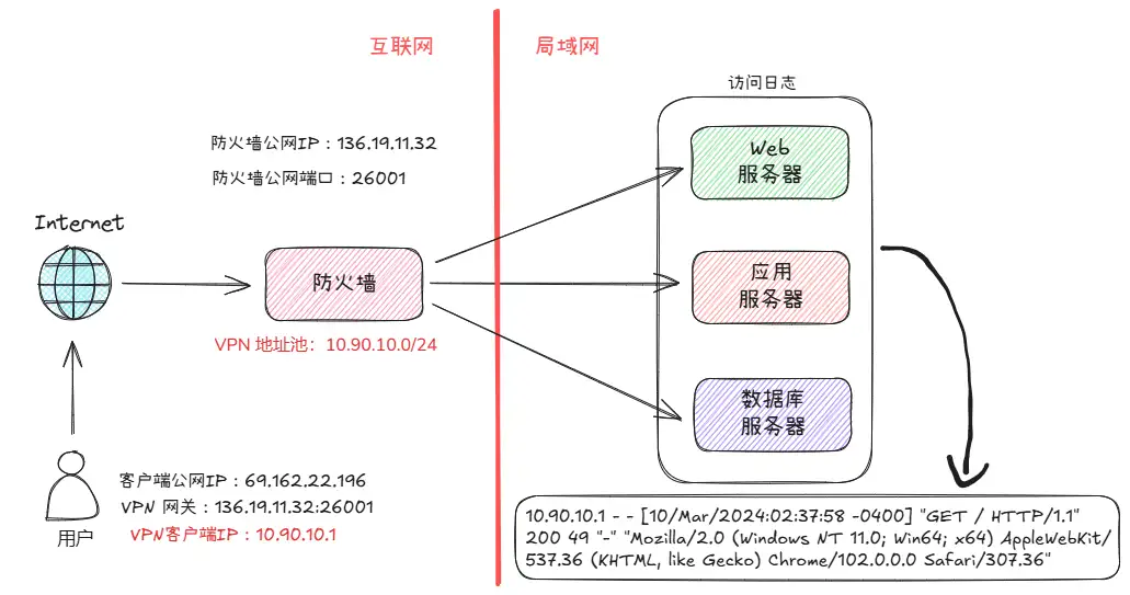 这种方式的好处就是没有OpenVPN Server服务,有分配局域网独立的VPN网段,用户登录VPN后,分配的VPN地址都是独立的,访问内网信息系统的请求IP都是VPN客户端IP,无论是该IP再尝试爆破服务密码,或者在做什么违规操作,直接拉黑指定的VPN客户端IP,都不会影响其他用户,甚至根据要求配置ACL策略。