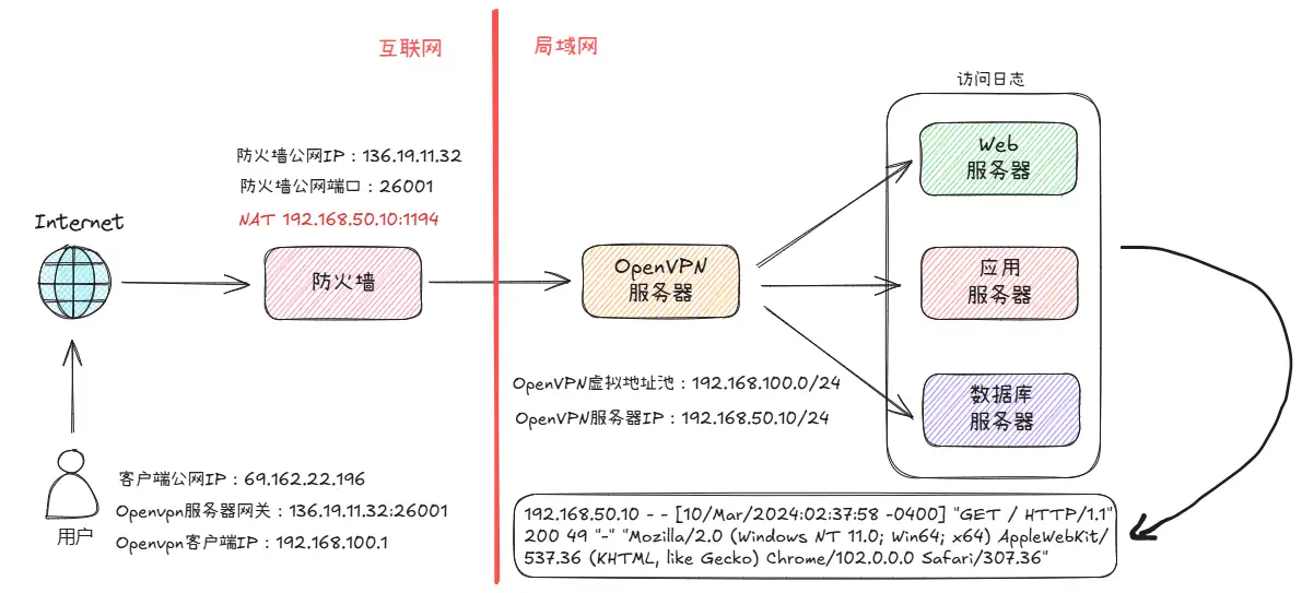 OpenVPN设计就是以匿名性为主,所有用户连接到OpenVPN Server只有服务器端日志记录登录账号、时间、用户公网IP、分配的虚拟IP、登录状态等等字段信息,但问题是用户访问企业内网服务所显示的请求IP,都是OpenVPN Server IP,而不是OpenVPN Server分配的虚拟IP地址,所以不好追溯是谁有违规操作。