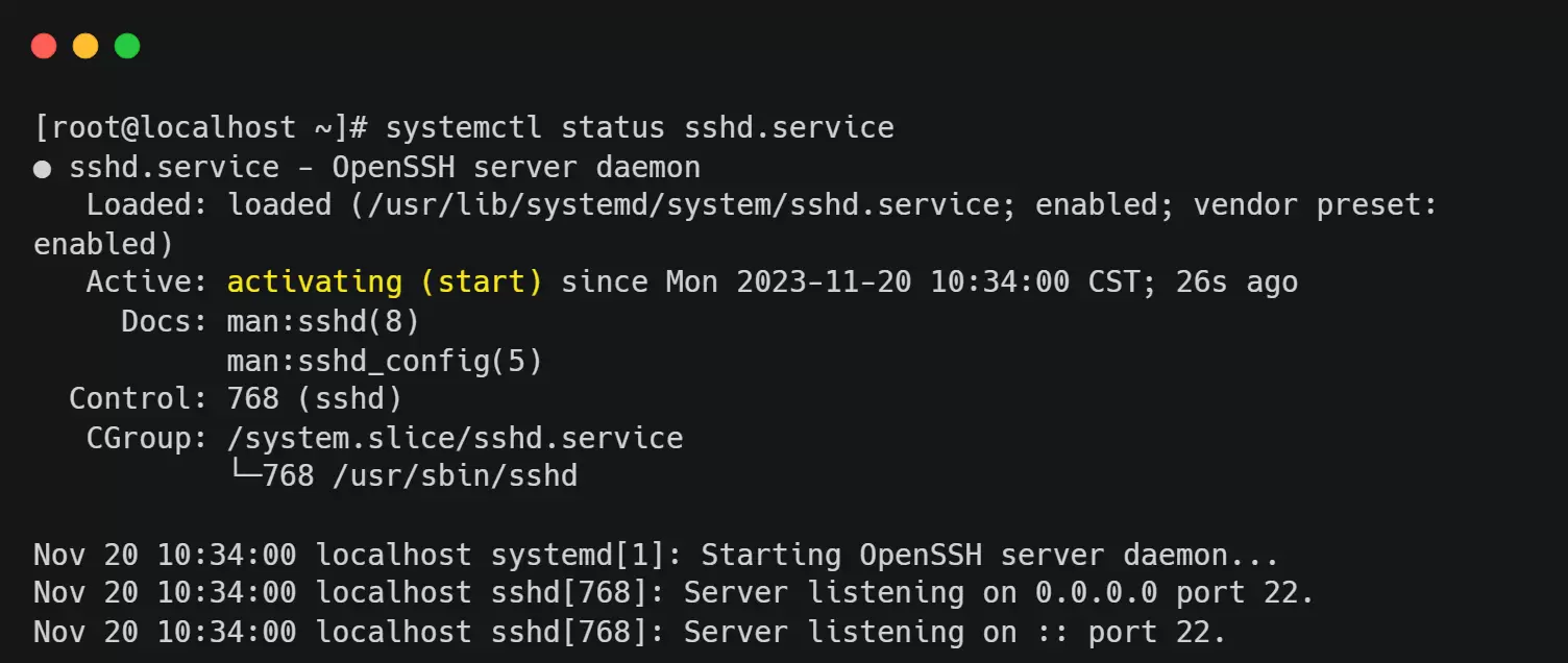sshd status display activating (start)